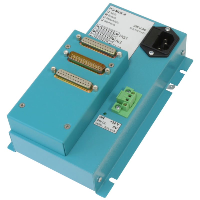 PG-MUX-II for SiemensDoubled PG-interface +++ HMI and PG parallel to S5-PLC +++ Prof. device, of active ports +++ Universal power supply +++ All connections on the front +++ For Siemens S5-90U-155U
