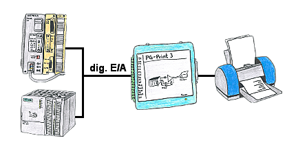 - The PG-PRINT has to be connected to the normal PLC-I/O-level with a cable (not scope of the standard delivery) via 8 digital outputs and 1 digital input and the provided PLC-software installed in the S5-PLC